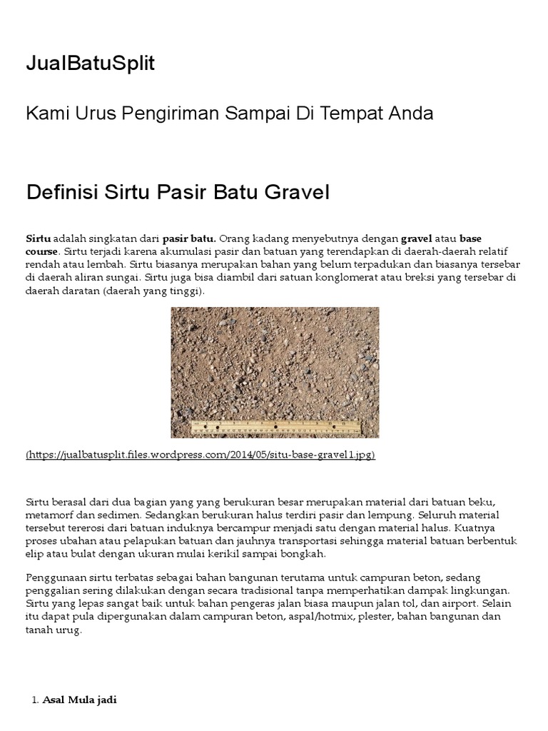 Pasir Batu Sirtu : Mengenal jenis pasir batu dan kegunaanya hub.. Pasir batu (sirtu) digunakan sebagai bahan campuran beton saat melakukan pembangunan. Di dalam konstruksi bangunan, batu kali dikelompokan menjadi tiga bagian berbeda, seperti: Cari pasir batu di indonesia, distributor pasir batu, supplier, dealer, agen, importir, kami mempunyai database terlengkap untuk pasir batu indonesia. Jual pasir merapi, batu kali pondasi, split 1/2, split 2/3, sirtu, urug tanah. Makna ilmiyahnya sirtu adalah singkatan dari kata pasir batu.